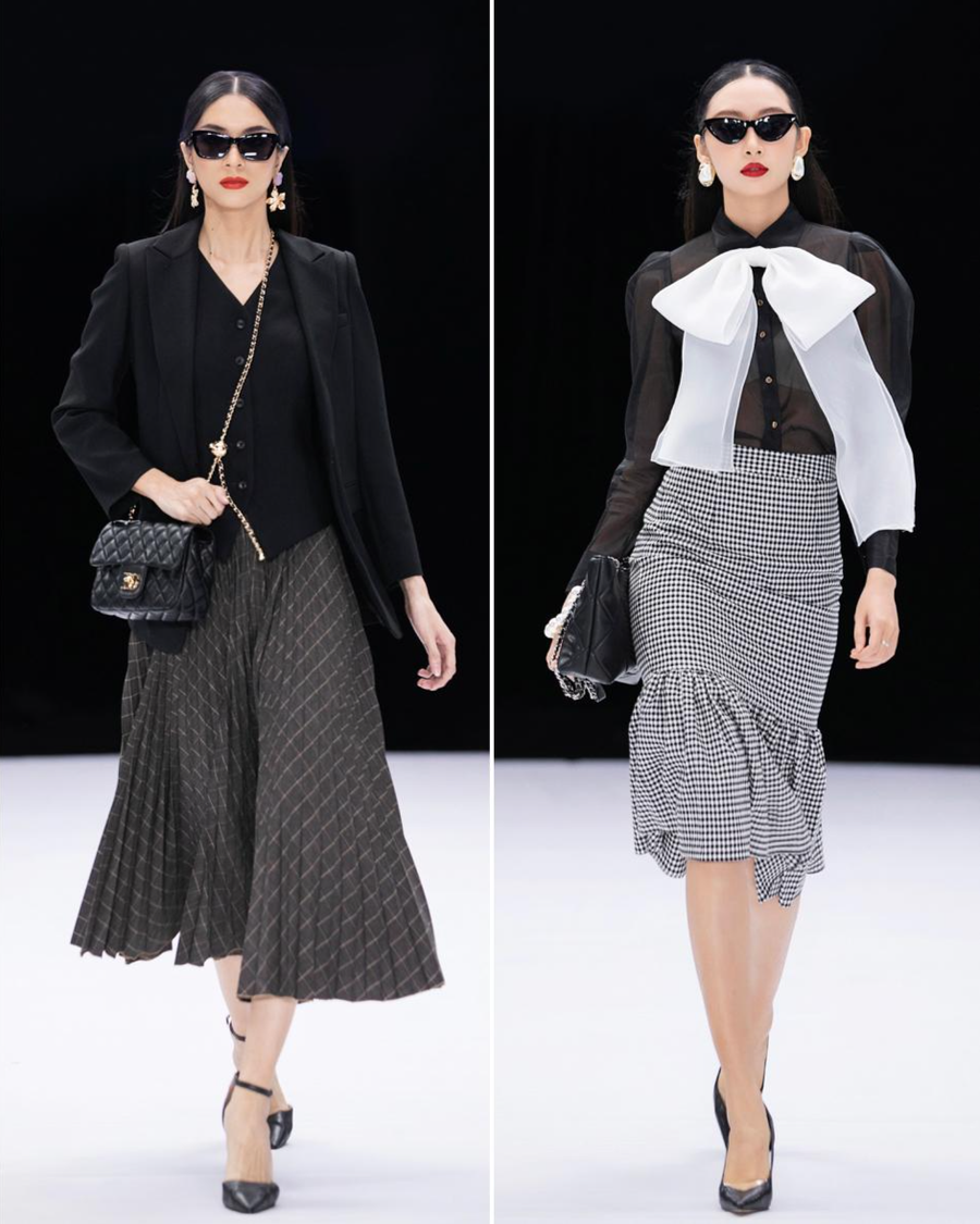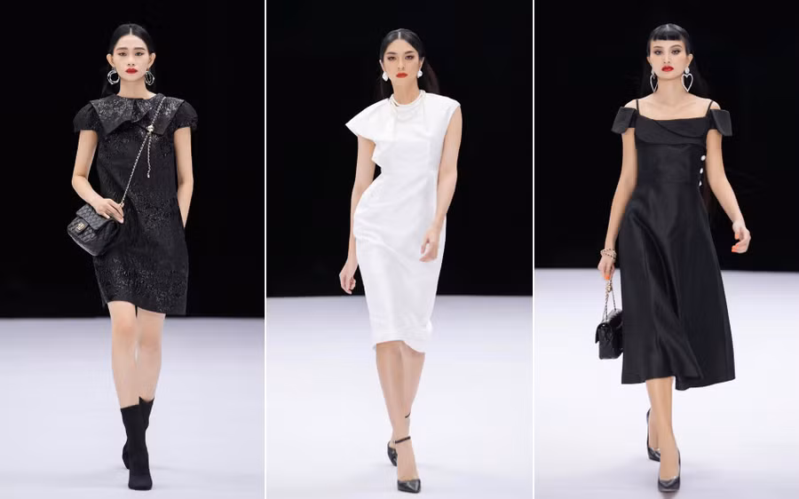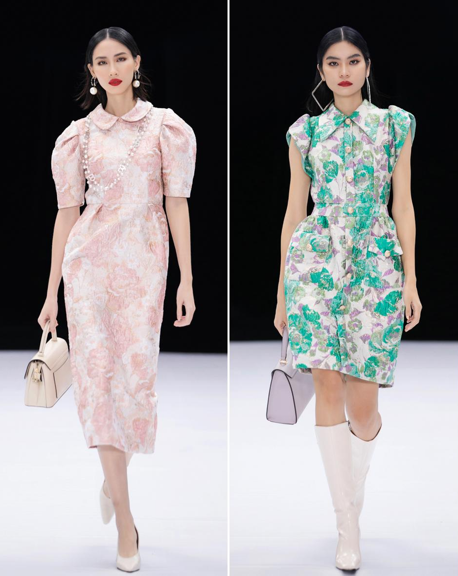Các mẫu váy xòe có thắt eo, đầm bodycon, váy chữ A tay chồm... được tạo điểm nhấn bằng các chi tiết biến tấu ở cổ, cầu vai. Phần lớn trang phục đều mang phong cách cổ điển và dễ dàng kết hợp các phụ kiện tối giản và trang sức.