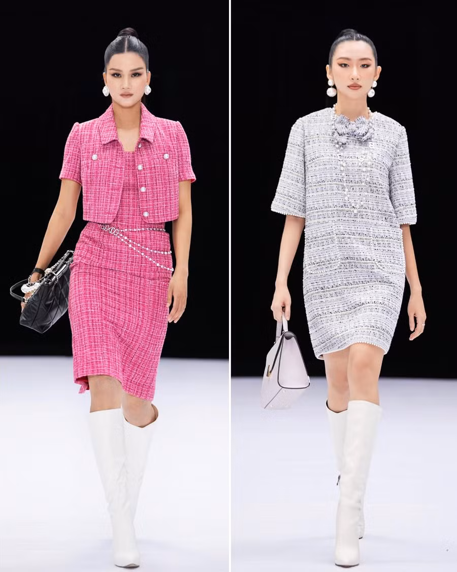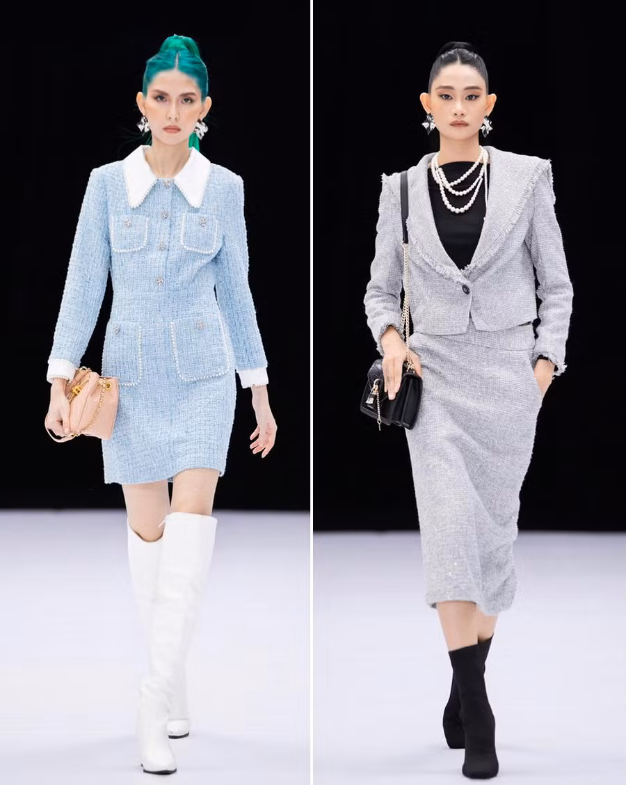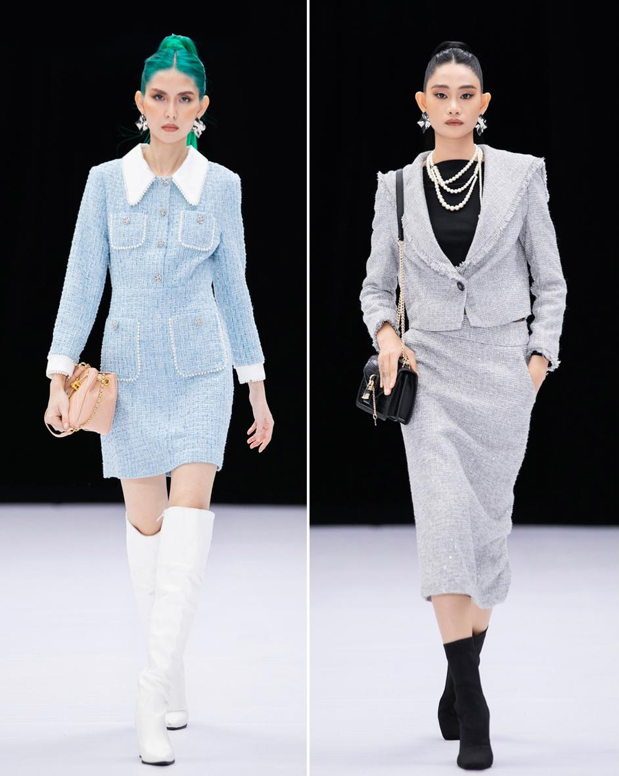 Với mùa thời trang cuối năm, vải tweed như một dấu ấn đặc trưng không thể thiếu. Đỗ Mạnh Cường chọn loại vải có độ dày vừa phải phù hợp với thời tiết của Việt Nam và phát triển các kiểu phom dáng vô cùng đa dạng - từ váy dài dạng vest đến áo khoác, chân váy, các kiểu váy chữ A hay váy xòe...
