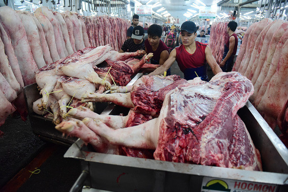 Thịt heo tại chợ đầu mối Hóc Môn (TP.HCM) vẫn dồi dào - Ảnh: QUANG ĐỊNH