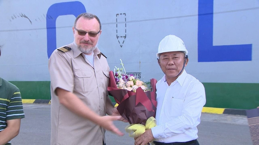 Ông Nguyễn Hữu Phúc tặng hoa một thuyền trưởng nước ngoài hồi tháng 8/2019. Ảnh: Ly Ly
