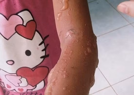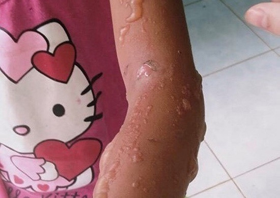 Những vết bỏng rát trên tay một bé sau khi đi bắt bọ 3 sọc về bán. Ảnh: Dân Việt