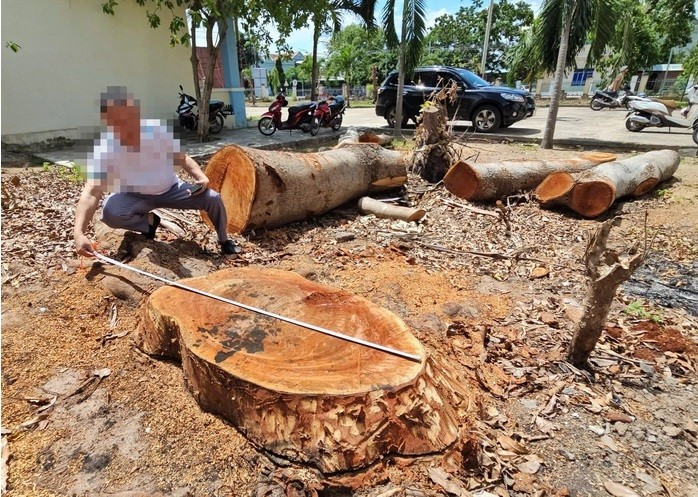 Theo quan sát trực tiếp của P.V, có 7 cây xanh bị cưa hạ trong khuôn viên trụ sở UBND phường Cheo Reo. Trong đó, 2 cây có đường kính 60-70 cm; các cây còn lại có đường kính 30-40 cm. Điều này cho thấy, số cây xanh trên được trồng đã lâu năm. Các cây này nằm cách tường rào khoảng 1 m. Rễ cây lớn, ăn sâu, trồi cả lên mặt đất.