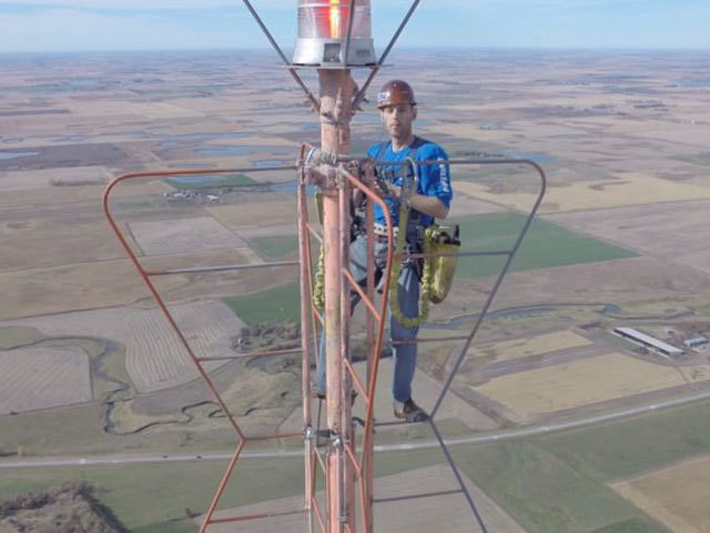 Kevin Schmidt đang leo lên ngọn tháp ăng ten truyền hình có độ cao 538m để thay bóng đèn. Ảnh Wholesomeposts.
