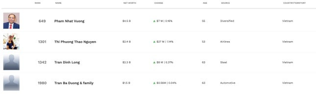 Theo danh sách tỷ phú Forbes, hiện, Việt Nam có 5 tỷ phú USD, gồm: Chủ tịch Vingroup Phạm Nhật Vượng, Chủ tịch VietJet Air Nguyễn Thị Phương Thảo, Chủ tịch Hòa Phát Trần Đình Long, Chủ tịch Thaco Trần Bá Dương cùng gia đình, Chủ tịch Techcombank Hồ Hùng Anh.