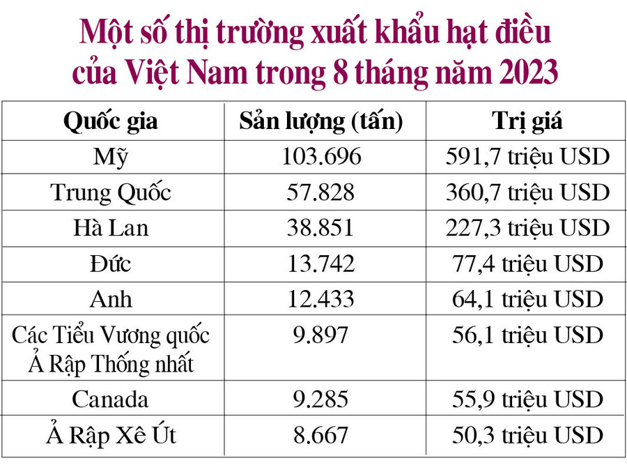 Trong 8 tháng năm 2023, Mỹ và Trung Quốc vẫn là những khách hàng lớn nhất của hạt điều Việt Nam, chiếm tới 41,8% tổng kim ngạch xuất khẩu. Cụ thể, xuất khẩu hạt điều sang thị trường Mỹ đạt 103.696 tấn, trị giá 591,7 triệu USD; xuất khẩu hạt điều sang thị trường Trung Quốc đạt 57.828 tấn, thu về 360,7 triệu USD.