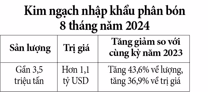 Lũy kế 8 tháng năm 2024, nhập khẩu phân bón đạt gần 3,5 triệu tấn, trị giá hơn 1,1 tỷ USD (tăng 43,6% về lượng, tăng 36,9% về trị giá so với cùng kỳ năm 2023).