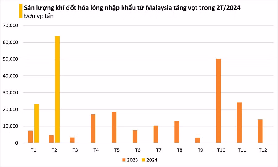 Lũy kế 2 tháng, Việt Nam chi hơn 60 triệu USD để nhập khẩu 87.100 tấn LPG từ Malaysia, tăng tới 616% về lượng và tăng 523% về giá trị, chiếm tỷ trọng hơn 17% cả về lượng và kim ngạch nhập khẩu. Giá nhập khẩu bình quân từ Malaysia hiện khoảng 689 USD/tấn, giảm gần 13% so với cùng kỳ năm 2023 (xem bảng).