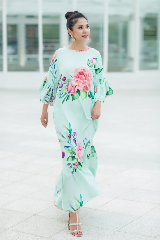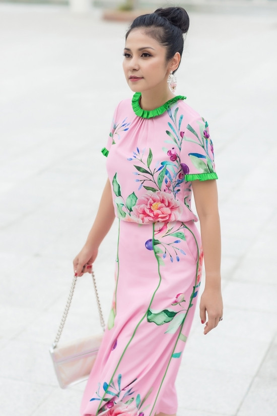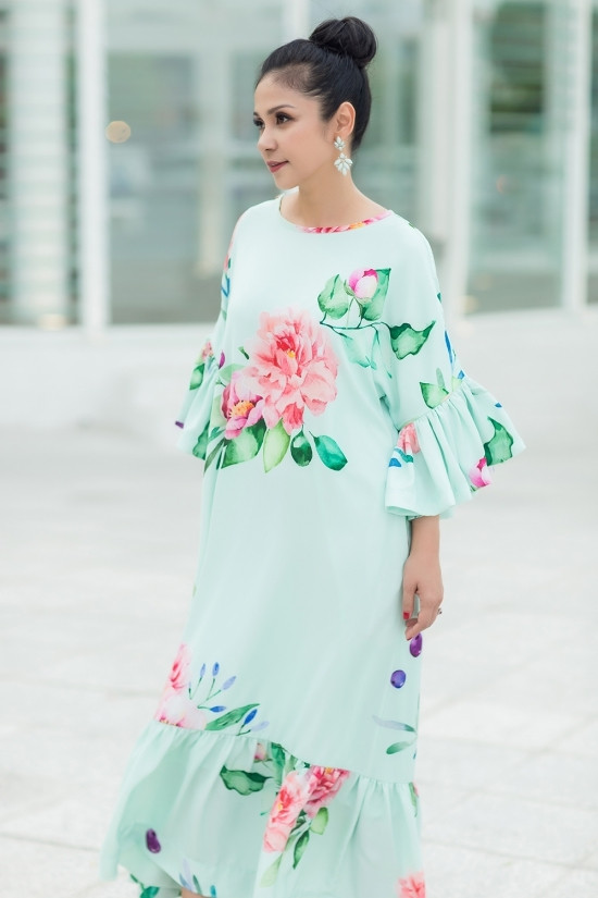 Với dáng đầm maxi, kín đáo, Việt Trinh chọn cách búi tóc gọn gàng để tôn gương mặt, giúp tổng thể không bị nặng nề.