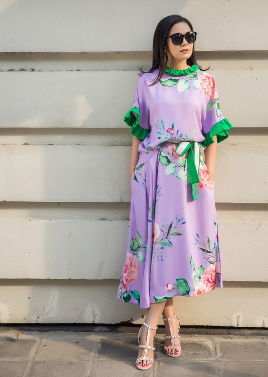 Người đẹp 46 tuổi được tôn dáng với đầm suông màu tím pastel, kết hợp sandals platform xanh da trời.