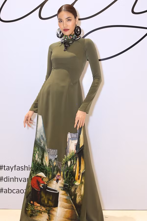 Người mẫu Lan Khuê diện trang phục in hình ảnh phố cổ Hội An, phối cùng bông tai oversize.