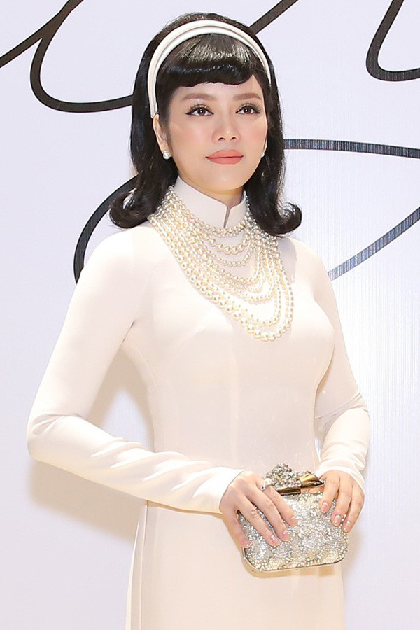 Lý Nhã Kỳ diện áo dài cao cổ, đeo vòng ngọc trai.