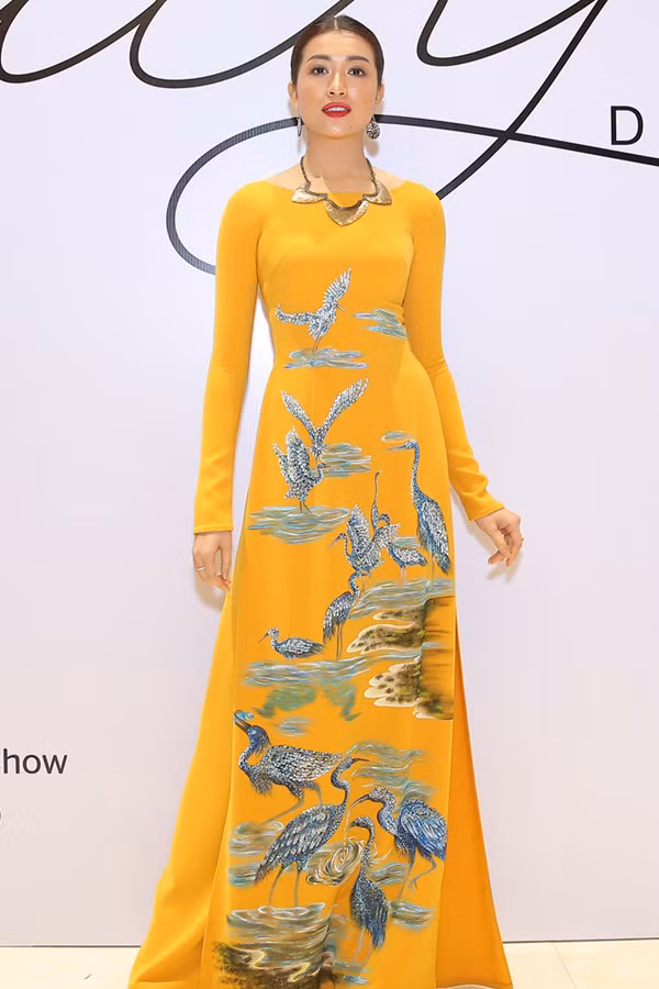 Á hậu Hoàn vũ 2015 chọn áo dài với hoa văn thêu tay.