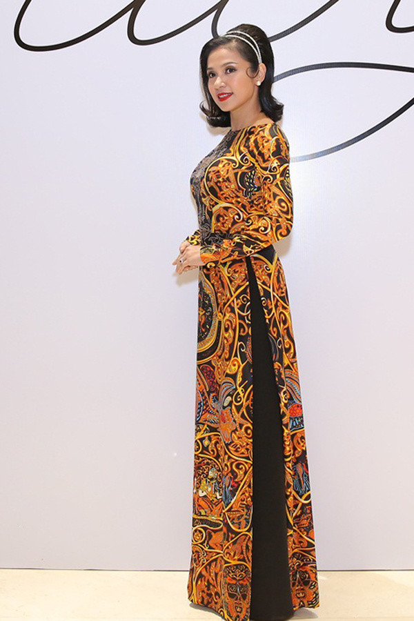 Việt Trinh mặc áo dài cổ thuyền với hoa văn đối xứng. Trang phục truyền thống ôm dáng, chít eo giúp tôn hình thể của diễn viên nổi tiếng thập niên 1990. Chị phối với phụ kiện là bông tai ngọc trai, vòng chuỗi hạt, để tóc uốn xoăn cổ điển.