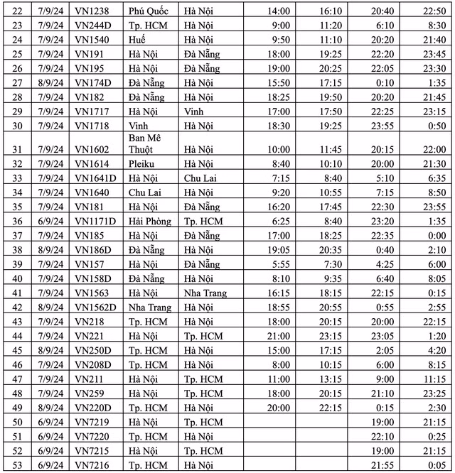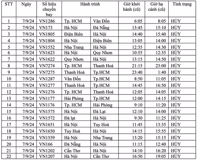 Cụ thể các chuyến bay của Vietnam Airlines bị hủy và điều chỉnh giờ khai thác như sau: