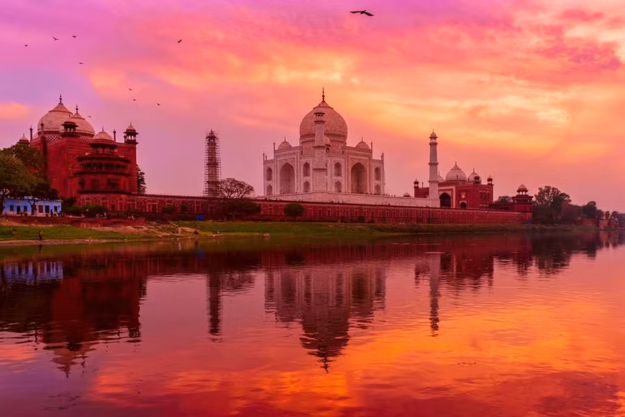 Được xếp vào một trong 7 kỳ quan thế giới đương đại, đền Taj Mahal là điểm đến mơ ước của nhiều du khách. Đền được xây dựng từ đá cẩm thạch trắng, khi mặt trời đi xuống, ánh nắng cuối ngày chiếu lên công trình tạo khung cảnh choáng ngợp. Đây cũng là điểm săn ảnh nổi tiếng với nhiều nhiếp ảnh gia trên thế giới.