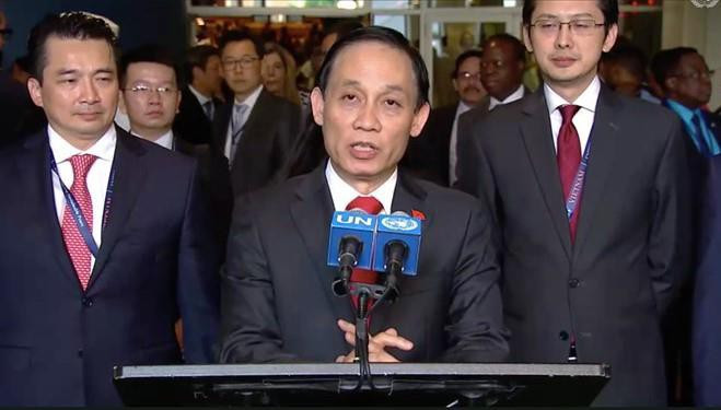 Thứ trưởng Ngoại giao Lê Hoài Trung phát biểu trước báo giới sau khi Việt Nam được bầu vào HĐBA hôm 7/6. Ảnh: Liên Hợp Quốc.