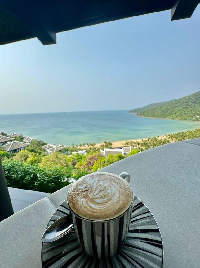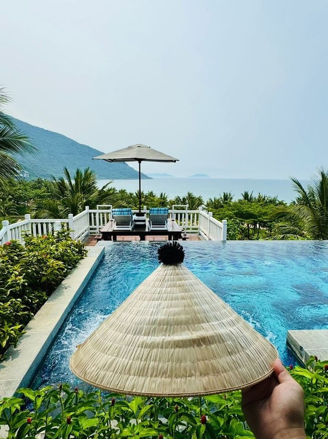 Trong nhóm chat riêng với fan trên Weibo, Lâm Chí Dĩnh chia sẻ hình tại khu nghỉ dưỡng sang trọng, cầm nón lá, uống cà phê và tận hưởng buổi sáng trên đất Việt Nam. Căn phòng của vợ chồng tài tử có bể bơi và tầm nhìn hướng thẳng ra biển.