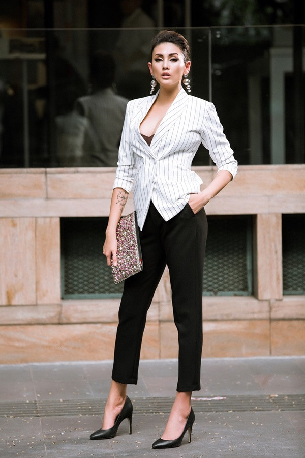 Võ Hoàng Yến chọn những thiết kế công sở với tông màu đen và trắng làm chủ đạo.