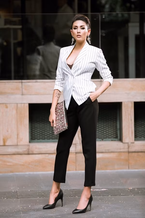 Blazer kẻ sọc là một trong những món vũ khí lợi hại giúp tạo cảm giác vóc dáng thon thả. Người đẹp kết hợp cùng áo hai dây và quần âu.