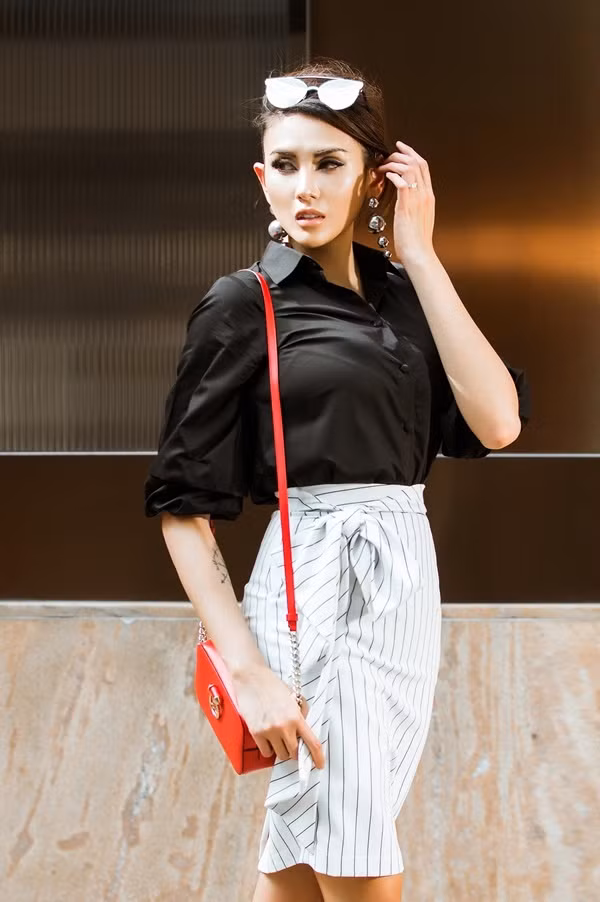 Điểm nhấn của bộ đồ nằm ở chiếc túi xách màu đỏ. Phối ba màu kinh điển đen - trắng - đỏ là cách kết hợp cơ bản và hiệu quả được nhiều tín đồ thời trang thế giới áp dụng.