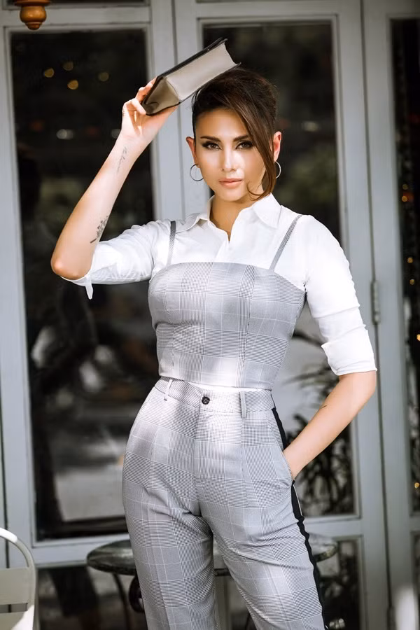 Siêu mẫu trong bộ đồ màu ghi kẻ ca rô.