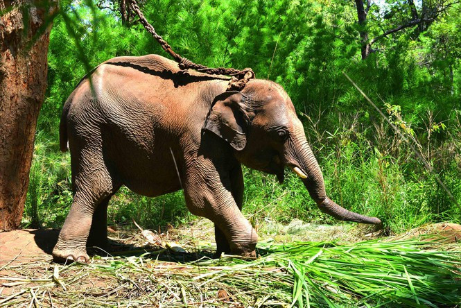 Chú voi con này khi đó khoảng 5 tuổi, có đôi ngà cân xứng, đẹp, dài hơn hai tấc, vòi voi bị 1 chiếc bẫy cặp kẹp cứng. Bàn chân trái của voi cũng bị sợi cáp của một chiếc bẫy thòng lọng siết chặt, nhiễm trùng nặng. Voi hoang sợ hãi lẩn trốn nên đoàn cứu hộ gồm cả chục cán bộ nhân viên của 2 đơn vị VQGYĐ, TTBTV cùng các nài voi giỏi và 1 cặp voi lớn đã thuần dưỡng phải lùng sục, bao vây cả tuần lễ mới dong được chú voi bị thương này về, cột vào thân cây cổ thụ sau trạm kiểm lâm số 9 để cứu chữa.