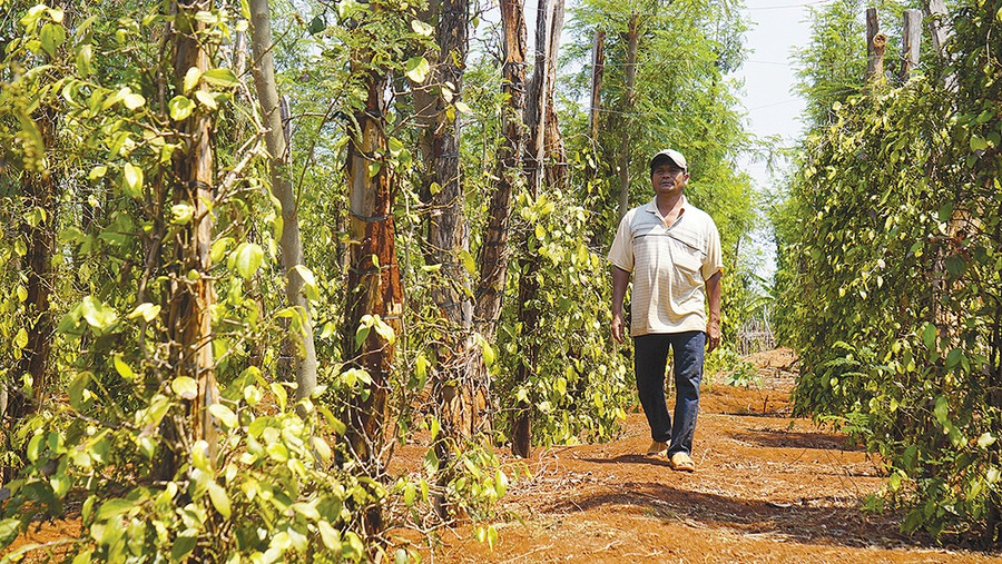 Tiếp xúc với chúng tôi, ông nhớ lại thời hoàng kim đã qua: “Năm 1996, gia đình tôi bắt đầu xuống giống với 300 trụ tiêu. Cứ mỗi năm bán tiêu có lời tôi lại mua đất, đặt trụ rồi xuống giống tiêu ở đó. Đến năm 2014, khi hồ tiêu được giá, nhà tôi đã sở hữu vườn tiêu hơn 10.000 trụ. Liên tiếp trong hai năm 2014 - 2015, giá tiêu cao ngất ngưởng nên gia đình tôi thu về hơn 2 tỷ đồng”.