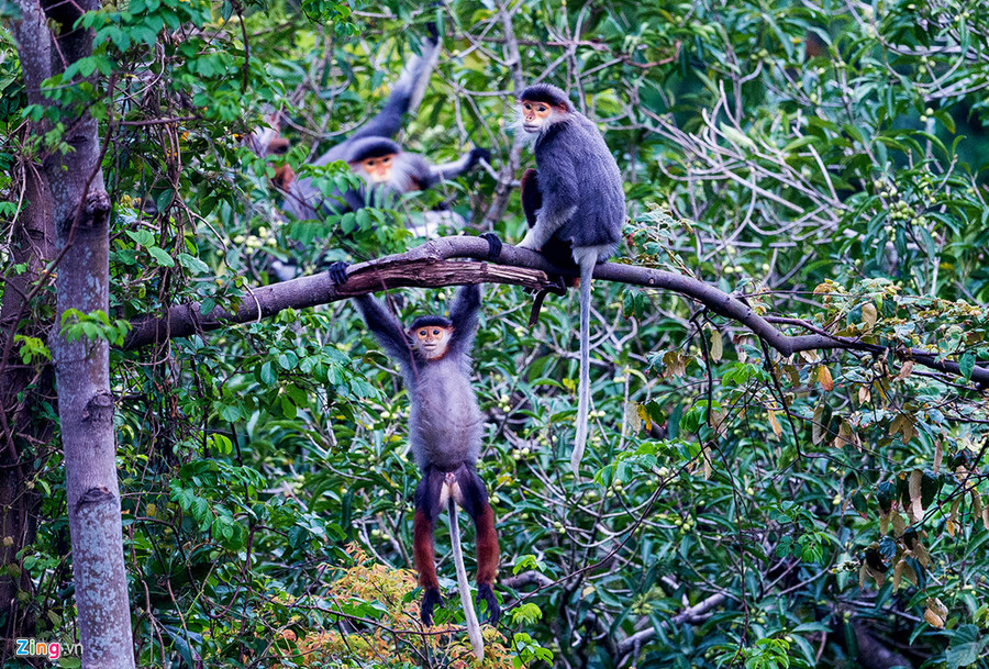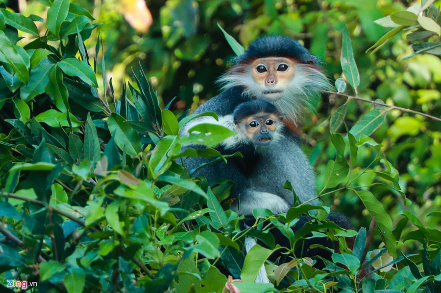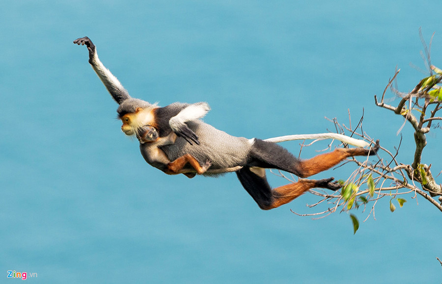 Voọc mẹ ôm con chuyền cành trên bán đảo Sơn Trà. Theo Tổ chức Bảo tồn thiên nhiên quốc tế (IUCN), loài này đang đối diện với nguy cơ tuyệt chủng cao, đứng thứ hai trong danh mục đỏ của IUCN về các loài động vật hoang dã bị đe dọa. Hàng ngày, vào sáng sớm hoặc chiều tối, Voọc đi kiếm ăn ven bìa rừng.
