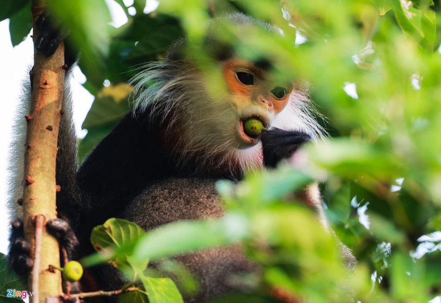 Voọc đang ăn trái sung giữa rừng. Voọc hiện phân bố chủ yếu ở phía Bắc bán đảo Sơn Trà với diện tích hơn 3.000 ha.