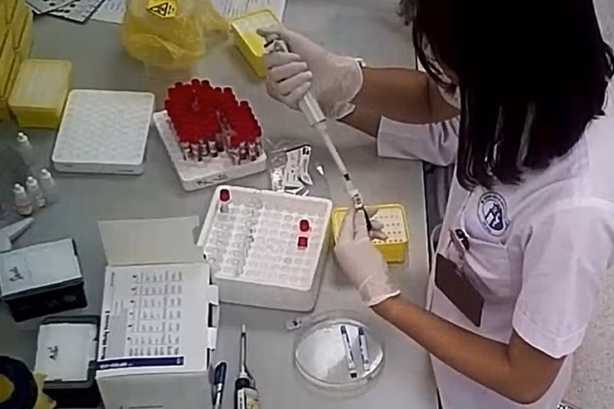 Nhân viên y tế trộn mẫu máu của bệnh nhân vào với nhau. Ảnh: chụp màn hình từ phóng sự điều tra của VTV24.