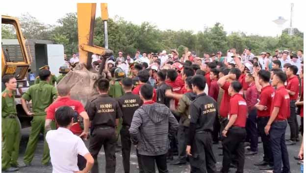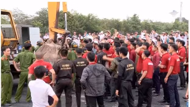 Nhân viên Alibaba ngăn cản lực lượng chức năng cưỡng chế tại khu đất ở xã Tóc Tiên, thị xã Phú Mỹ Ảnh: BÍCH NGỌC