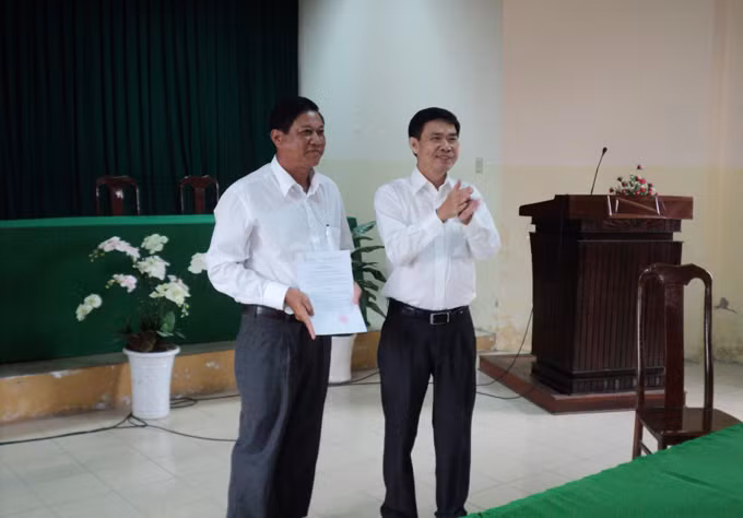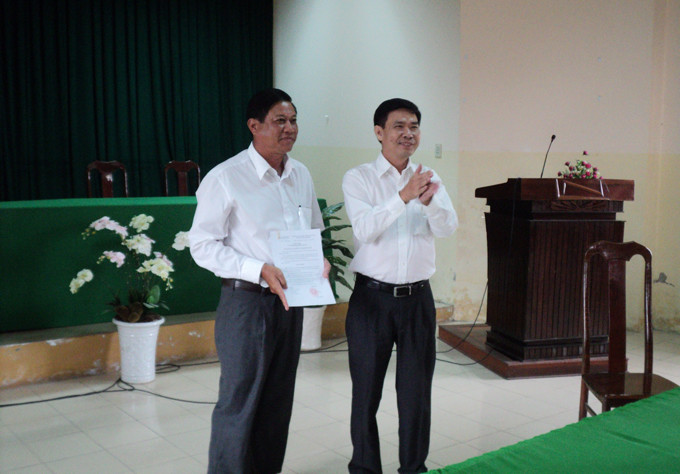 Ông Mai Anh Nhịn - Phó Chủ tịch UBND tỉnh Kiên Giang (bên phải) trao Quyết định của Chủ tịch UBND tỉnh Kiên Giang bổ nhiệm giám đốc Sở NNPTNT tỉnh Kiên Giang cho ông Nguyễn Văn Tâm tại buổi Lễ công bố ngày 2/12/2014. (Ảnh CTV).