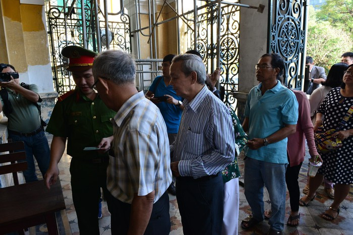 | Chủ tọa đọc quyết định đưa vụ án ra xét xử 8h30 ở bên trong phòng xét xử, thư ký phổ biến nội quy phiên tòa, tiếp đó Chủ tọa Phạm Lương Toản đọc quyết định đưa vụ án ra xét xử. Trong khi đó, nhiều người được triệu tập, luật sư tham gia bào chữa vẫn đang xếp hàng làm thủ tục và phóng viên vẫn chưa được vào tác nghiệp. |