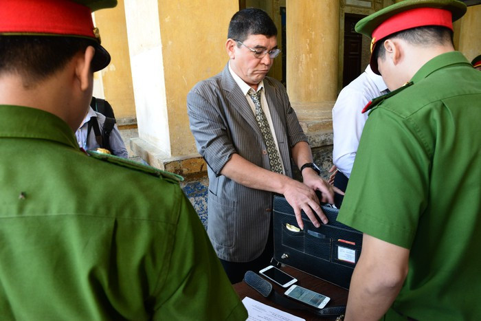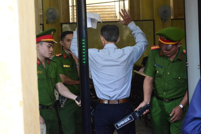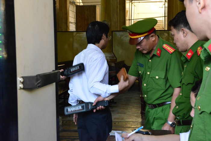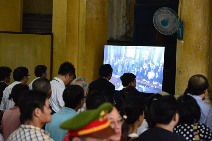 | An ninh thắt chặt Số lượng người có quyền lợi nghĩa vụ liên quan, người làm chứng và luật sư bảo vệ quyền lợi cho bị cáo lên đến khoảng 400 người. Họ vẫn đang xếp hàng dài để được vào bên trong. Phòng cho người dự khán được bố trí bên cạnh cửa phòng xử. Có một màn hình để theo dõi. An ninh thắt chặt, cảnh sát sử dụng máy quét kiểm tra an ninh. |