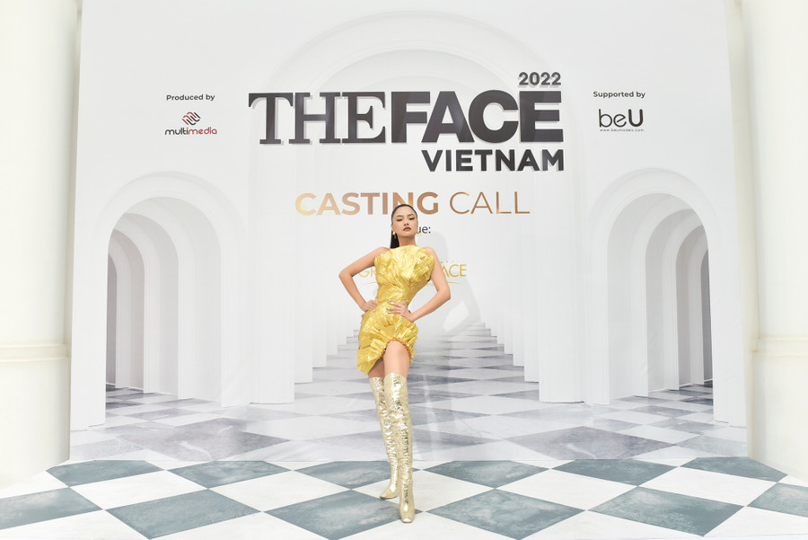 | Vũ Thu Phương diện đầm ngắn màu vàng độc đáo với các lớp xếp nếp xoáy phối boots cao ánh kim tôn dáng. Siêu mẫu cho biết cô chọn tone vàng vì ở vai trò mentor, cô sẽ “đãi cát tìm vàng” nhằm tìm ra những thí sinh xứng đáng nhất bước vào vòng trong của The Face Vietnam 2022. |