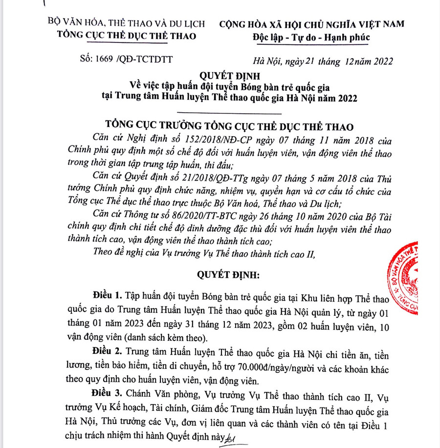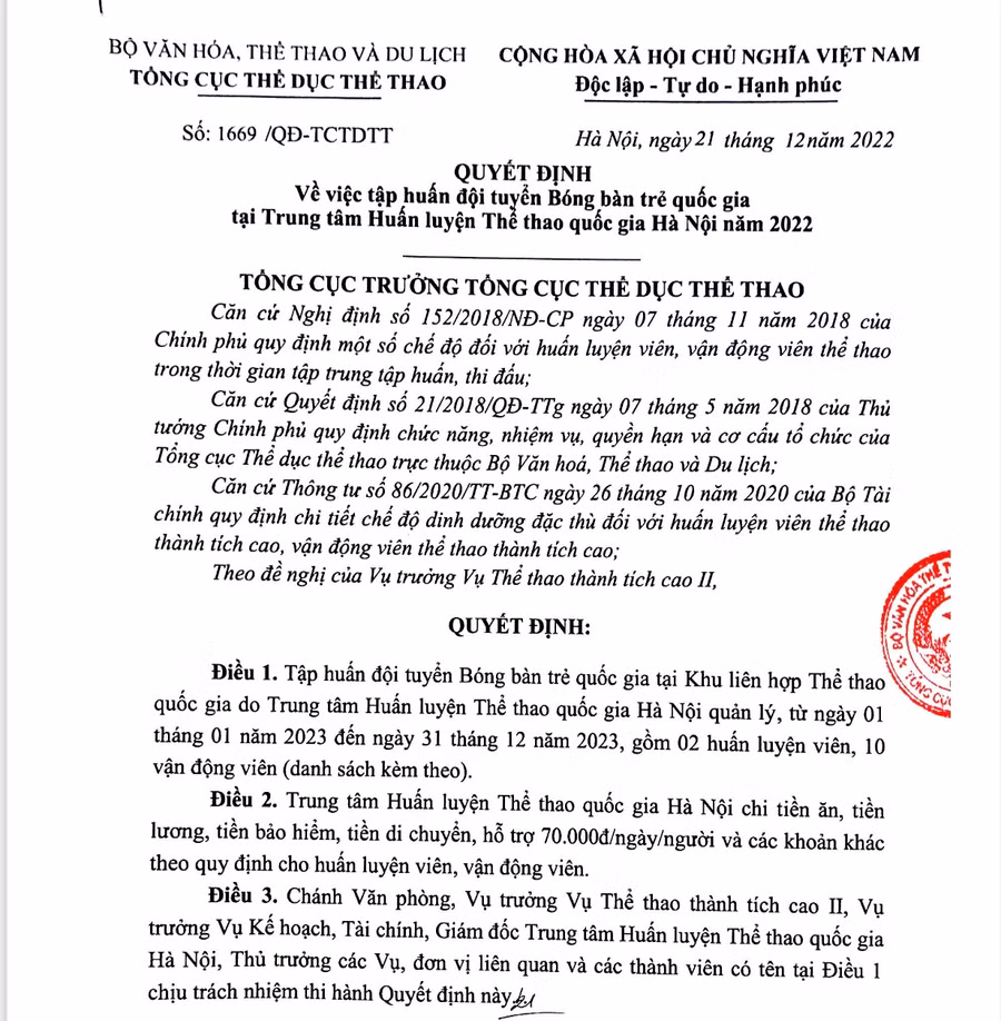 Thông tin từ Cục TDTT vào tối 3.10 về công tác quản lý, phục vụ đội tuyển bóng bàn trẻ quốc gia: xác minh và xử lý nghiêm những sai phạm. Cục TDTT đã chỉ đạo xác minh, làm rõ các vấn đề có liên quan mà cơ quan báo chí nêu trên đã đề cập. Trên cơ sở kết quả xác minh, Cục TDTT sẽ nghiêm túc chấn chỉnh, khắc phục những vấn đề còn tồn tại công tác quản lý, chỉ đạo tập huấn các đội tuyển nói chung, đội tuyển trẻ bóng bàn quốc gia nói riêng, nếu phát hiện có sai phạm sẽ xử lý nghiêm minh đối với các đơn vị, cá nhân có liên quan theo đúng quy định và sẽ có phản hồi tới các cơ quan báo chí trong thời gian sớm nhất.