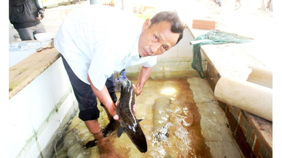 Ông Bảy Tú khoe một con cá chình mun “khủng” mà ông nuôi