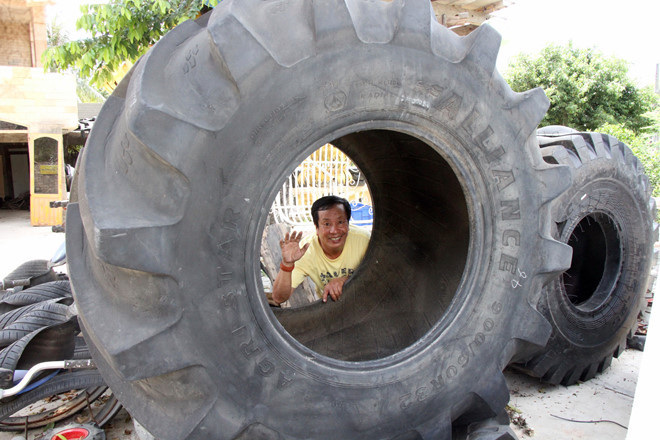 Ông Nguyễn Văn Phúng bên một lốp xe “khủng” mua về từ Campuchia. Ảnh: Nguyễn Chung