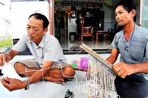 | Phó trưởng ấp Cái Cám Lâm Văn Nhanh cho biết: "Giờ ít ai ở Cái Cám này rỗi chuyện. Chồng đi biển câu kiều thì vợ ở nhà cũng có chuyện làm. Chuẩn bị ngư cụ cho nhà mình xong thì nhận hàng của Tổ hợp tác về gia công. Từ khâu tóm lưỡi, bắt giềng cho đến vô nẹp… ai cũng làm được. Mỗi ngày mỗi chị cũng kiếm cả trăm ngàn đồng". |