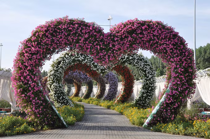 Lối vào Dubai Miracle gồm nhiều cổng vòm hình trái tim phủ đầy hoa như mời gọi du khách tới tham quan. Du khách sẽ thấy như đang thưởng ngoạn một triển lãm nghệ thuật đầy hấp dẫn khi khám phá những khu trưng bày hoa đẹp mắt tại đây. Những thiết kế này đều được thay đổi theo mùa.
