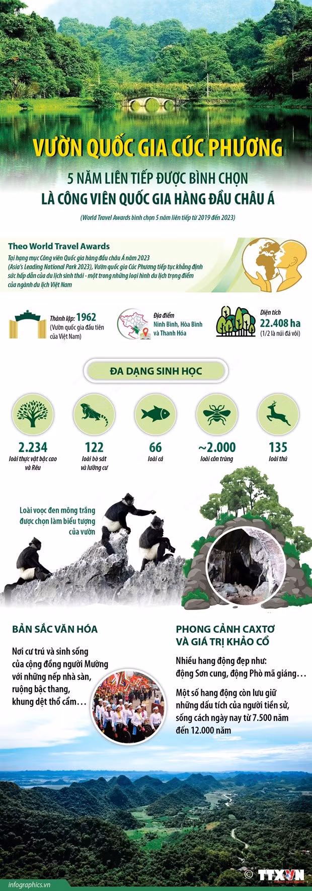 Vườn Quốc gia Cúc Phương là khu bảo tồn thiên nhiên, khu rừng đặc dụng nằm trên địa phận thuộc ba tỉnh Ninh Bình, Hòa Bình và Thanh Hóa. Được thành lập ngày 7/7/1962 theo quyết định 72-TTg của Thủ tướng Chính phủ, là đơn vị bảo tồn thiên nhiên đầu tiên của Việt Nam với cảnh quan thiên nhiên độc đáo, sự đa dạng về hệ sinh thái động thực vật cũng như các giá trị văn hóa lịch sử, Vườn Quốc Gia Cúc Phương đã trở thành một trong những địa điểm du lịch sinh thái nổi tiếng và hấp dẫn nhất cả nước hiện nay. Đây là Vườn Quốc gia đầu tiên của Việt Nam thực hiện nhiều sản phẩm du lịch có trách nhiệm với môi trường, được quốc tế bình chọn là Điểm đến hàng đầu châu Á liên tiếp từ năm 2019-2023./.
