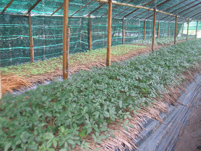 Nếu mường tượng các vườn sâm NL phải được trồng dưới các tán rừng nguyên sinh, nơi có sẵn thảm thực vật mục dày ở dãy Ngọc Linh heo hút với độ cao từ 1.600 - 1.800 m, sẽ rất bất ngờ khi đến vườn sâm của nhóm nhà khoa học Việt - Hàn. Vườn sâm của họ nằm ở độ cao 1.400 m, không cách xa quốc lộ, nhìn từ xa cứ ngỡ như khu nhà kính trồng rau. Trên đường đi vào vườn, TS Hồng Vân nói: “Việc sản xuất sâm VN (sâm NL - PV) hiện nay chủ yếu theo phương pháp truyền thống, trồng dưới tán rừng. Còn vườn sâm ở đây được chăm sóc trong hệ thống mái che nhân tạo, kiểm soát tối ưu độ chiếu sáng mặt trời, lượng nước tưới...”.