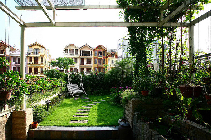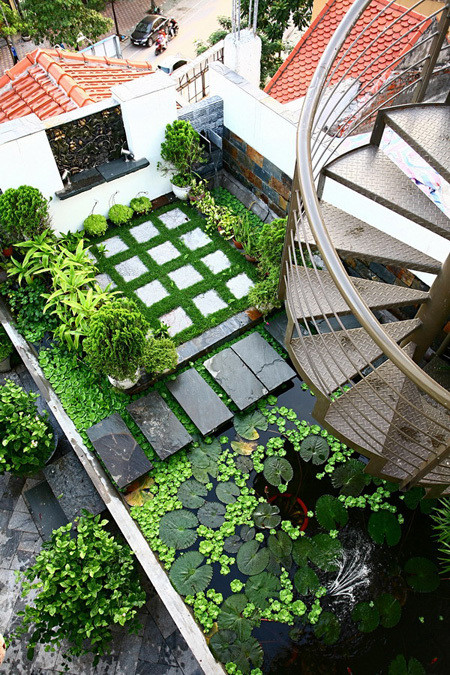 Vườn và hồ nước trên mái không chỉ làm đẹp mà có tác dụng chính là chống nóng hiệu quả.