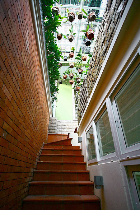 Cầu thang đi lên trên nhà được thiết kế mở thoáng lộ thiên với tầm nhìn là các mảng xanh.