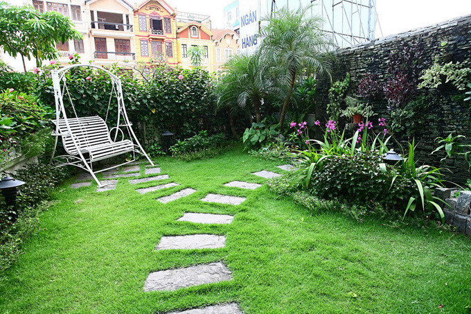 Mảng xanh của sân vườn kết nối với lối vào nhà và phòng khách qua một khoảng sân nhỏ. Nhìn từ sân, có cảm giác vườn cây như ở tầng một chứ không phải là mảnh vườn treo.