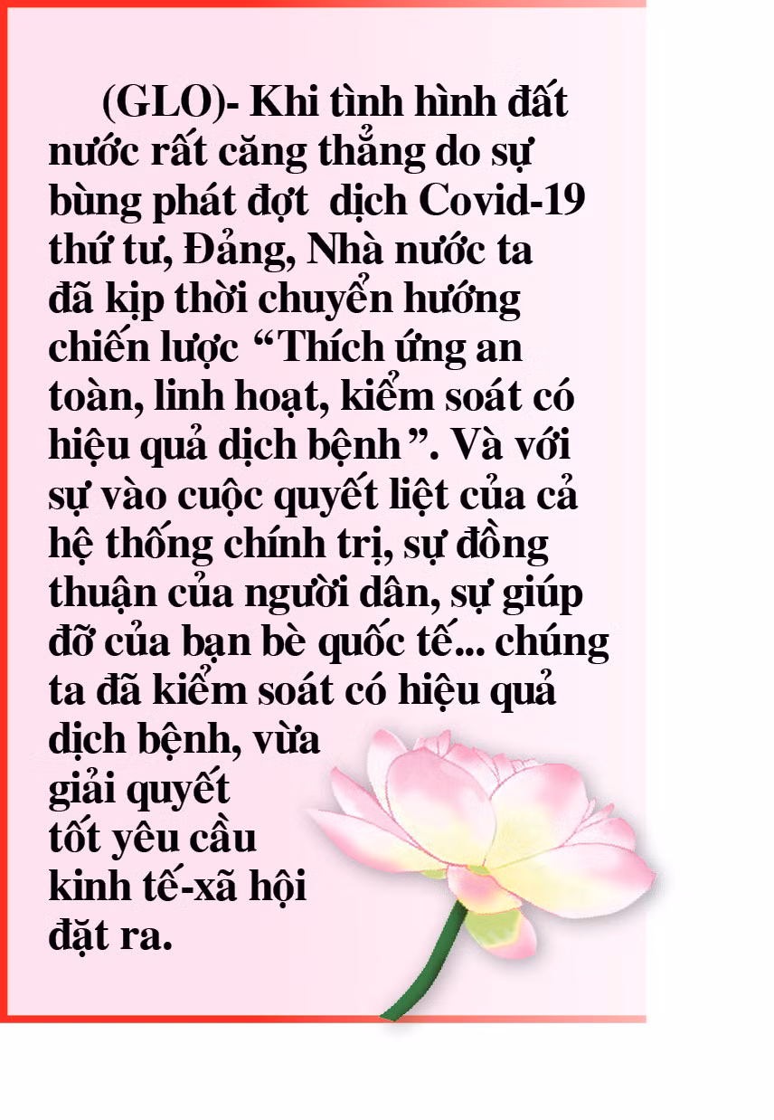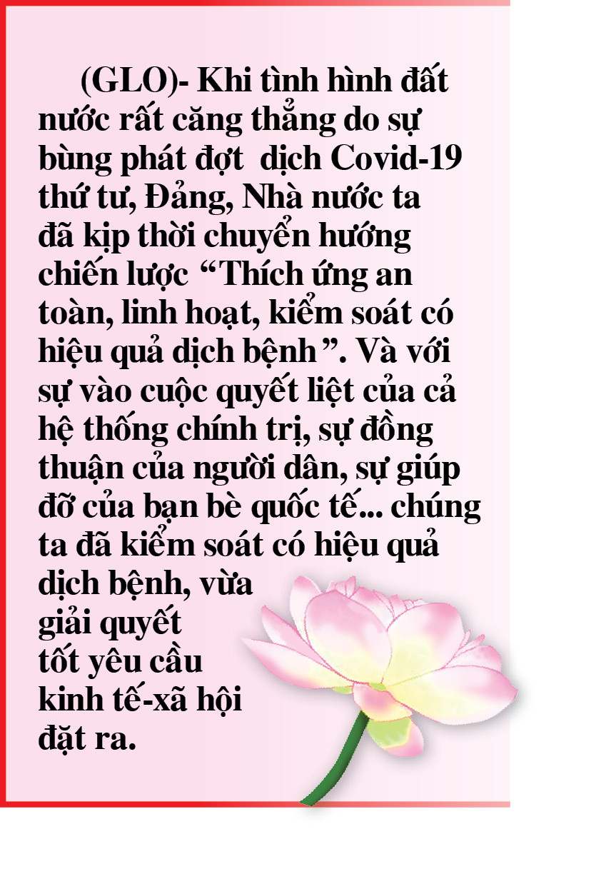 Và với sự vào cuộc quyết liệt của cả hệ thống chính trị, sự đồng thuận của người dân, sự giúp đỡ của bạn bè quốc tế và nhờ tiếp cận được vắc xin… chúng ta đã vừa phòng-chống, kiểm soát có hiệu quả dịch bệnh, vừa giải quyết tốt yêu cầu kinh tế-xã hội đặt ra. Có thể chứng minh cho nhận định này qua việc: Các ngành, các lĩnh vực chủ yếu của nền kinh tế đều phục hồi, có bước phát triển mạnh; khu vực du lịch, dịch vụ phát triển sôi động trở lại, nhất là từ sau khi kiểm soát được dịch bệnh; phát triển doanh nghiệp có nhiều khởi sắc; an sinh xã hội được bảo đảm, đời sống người dân được cải thiện, triển khai thực hiện kịp thời các chính sách xã hội, nhất là chính sách đối với người có công với cách mạng, chính sách bảo trợ xã hội và các chính sách, biện pháp hỗ trợ doanh nghiệp, người lao động, người dân bị ảnh hưởng nặng bởi đại dịch Covid-19… Đến nay, mặc dù trên thế giới chưa có quốc gia nào công bố hết dịch, nhưng với sự chuẩn bị kỹ lưỡng về nhiều mặt, chúng ta có cơ sở để thực hiện các biện pháp quyết liệt vừa bảo đảm bình ổn, vừa tiếp tục tăng trưởng nhanh hơn. Đó là lý do cắt nghĩa việc Việt Nam luôn nằm trong top đầu thế giới về các chỉ số phục hồi sau dịch Covid-19.