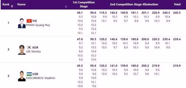 Xạ thủ Phạm Quang Huy đã thi đấu xuất sắc để giành huy chương Vàng ở nội dung 10m súng ngắn hơi Nam với 240,5 điểm, hơn người xếp thứ 2 là xạ thủ Hàn Quốc Lee Wonho 1,1 điểm.
