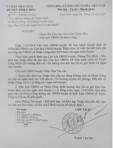Do không biết lấy nguồn kinh phí ở đâu để hoàn trả lại tiền cho 79 hộ dân, nên ngày 5-1-2019, UBND xã Thiệu Công đã có văn bản (được sự thống nhất giữa 3 trực là Đảng ủy, HĐND, UBND xã) trình Chủ tịch UBND xã huyện Thiệu Hóa xin vay 3,1 tỉ đồng từ ngân sách huyện để trả cho dân. UBND xã Thiệu Công cam kết sẽ hoàn trả lại số tiền trên cho huyện trước ngày 30-6-2019.