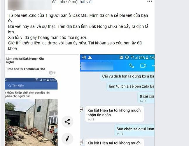 Trước đó, ngày 24/3, facebook có tên T.T.H đăng status với nội dung: “Cảnh báo Gia Nghĩa mình khi mua thịt lợn nha. Người quen làm bên kiểm dịch mới bắt ổ dịch ở Đăkmin hơn 800 con chôn rồi mà bọn gian thương đào lên mổ xẻ để bán đấy. Không phải cứ cầm miếng thịt tươi trên tay là an toàn đâu, hãy hết sức cẩn trọng trong mùa dịch này. Rất thông cảm cho nhà nuôi lợn sạch, nhưng đã ra tới chợ chẳng ai dám chắc miếng nào là của con lợn khỏe cả”.