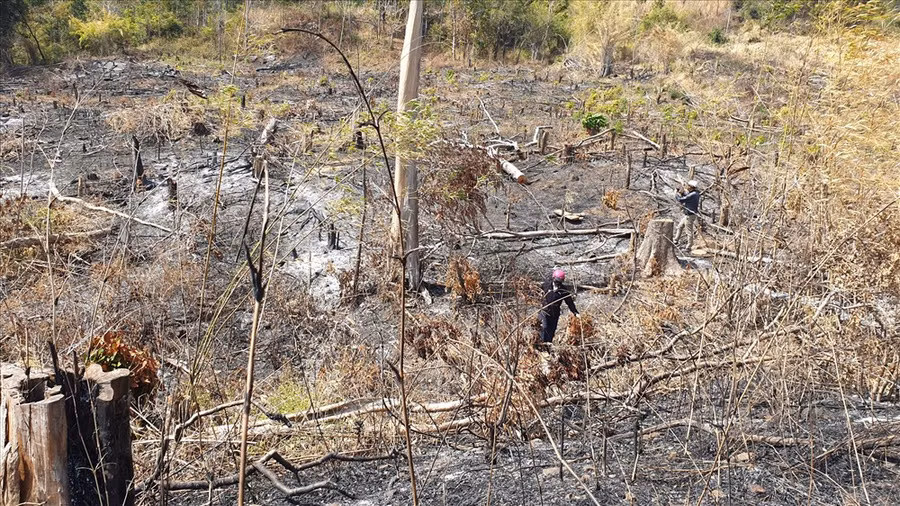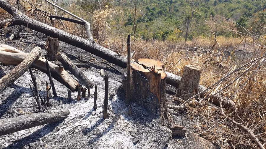 | Sau khi phá rừng, lâm tặc đốt trụi toàn bộ cảnh quan xung quanh. Ảnh: HL |